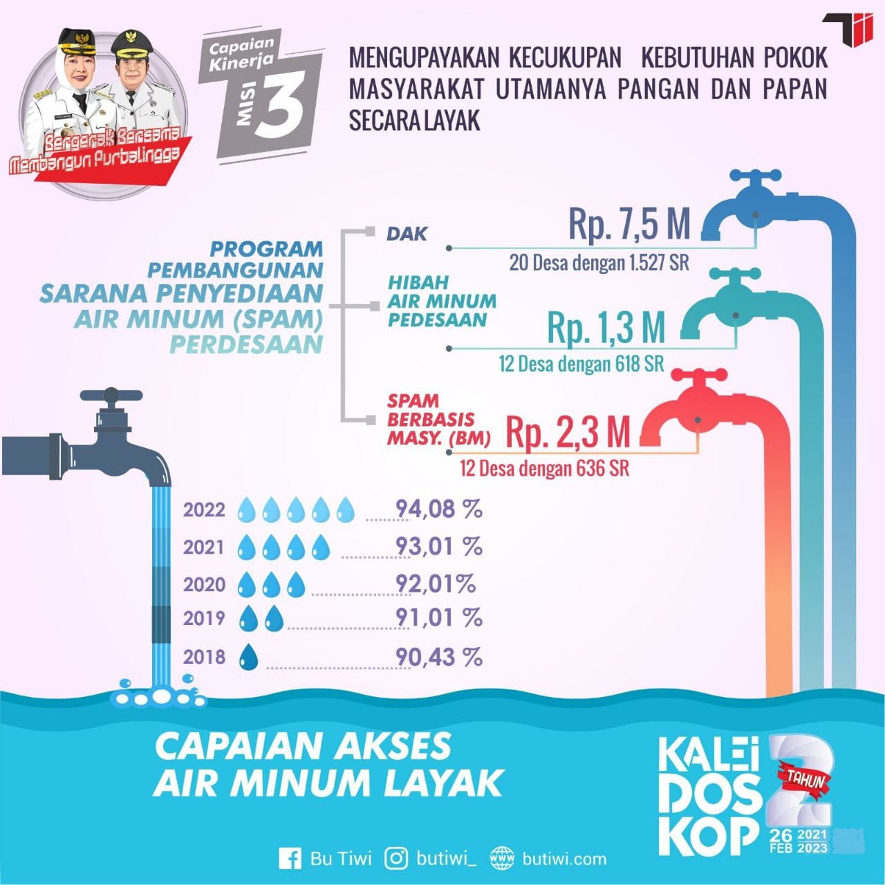 Berikutnya, pemkab berupaya keras untuk meningkatkan capaian akses air minum layak dengan program pembangunan Sarana Penyediaan Air Minum (SPAM) Pedesaan. Total anggaran yang dikucurkan sebanyak Rp 11,1 milyar yang terbagi melalui Dana Alokasi Khusus (DAK) sebesar Rp. 7,5 milyar sebanyak 1.527 Sambungan Rumah (SR), hibah air minum perdesaan sebesar Rp. 1,3 milyar untuk 618 SR dan SPAM berbasis masyarakat sebesar Rp 2,3 milyar untuk 636 SR. Hasilnya capaian akses air minum layak terus meningkat dan pada 2022 menjadi 94,08 %.