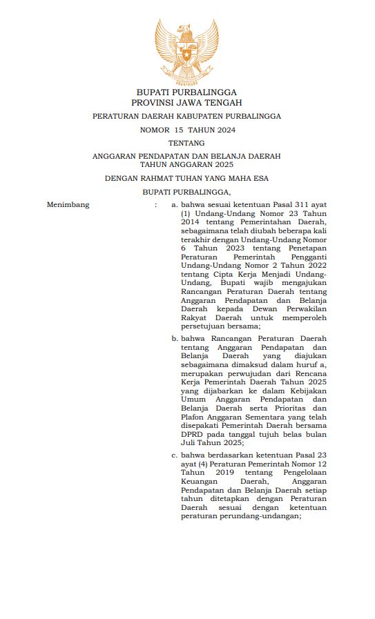 - Judul : PERATURAN DAERAH KABUPATEN PURBALINGGA NOMOR 15 TAHUN 2024 TENTANG ANGGARAN PENDAPATAN DAN BELANJA DAERAH TAHUN ANGGARAN 2025
