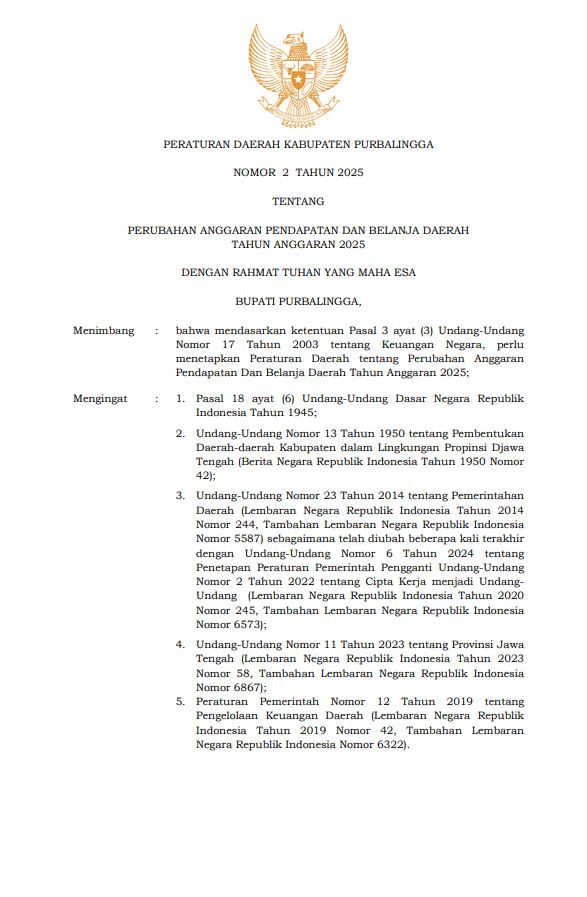 - Judul : PERATURAN DAERAH KABUPATEN PURBALINGGA NOMOR 2 TAHUN 2025 TENTANG PERUBAHAN ANGGARAN PENDAPATAN DAN BELANJA DAERAH TAHUN ANGGARAN 2025