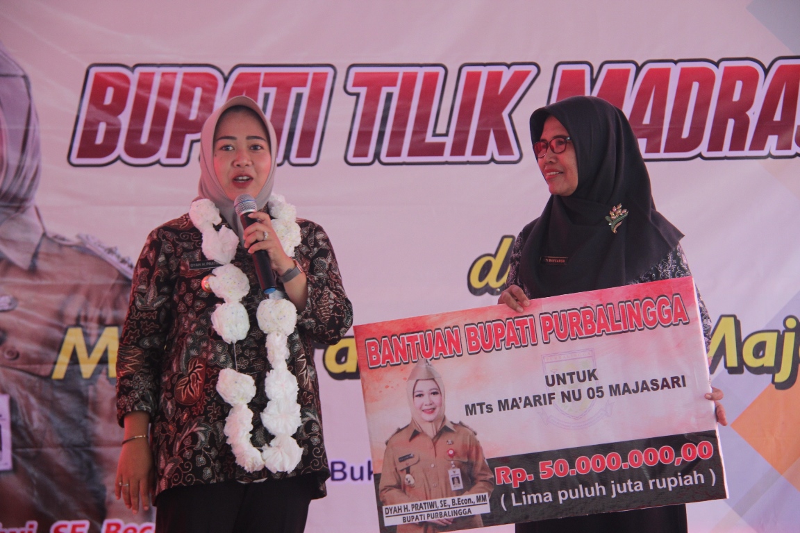 PURBALINGGA _ Bupati Purbalingga Dyah Hayuning Pratiwi memberikan bantuan berupa 1 set alat hadroh, bola kaki, bola voli, 2 buah sepeda dan bantuan hibah senilai Rp 50.000.000. kepada Madrasah Tsanawiyah (MTS) Ma’arif NU 05 Majasari Kec.Bukateja pada Jumat (31/1). Pemberian bantuan tersebut diserahkan saat bupati yang akrab dipanggil Tiwi melakukan kegiatan “Bupati Tilik Madrasah.