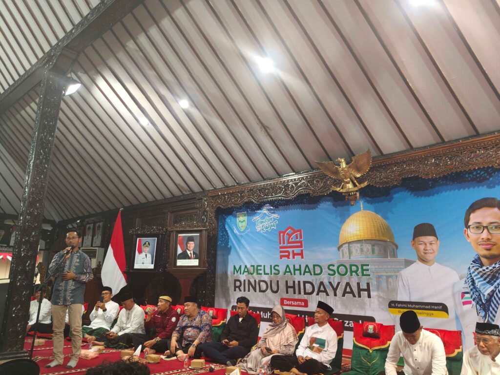 PURBALINGGA – Bupati Purbalingga, H. Fahmi M. Hanif menggugah kepedulian masyarakat Kabupaten Purbalingga terhadap penderitaan rakyat Palestina yang masih mengalami genosida. Bupati Fahmi mengajak masyarakat Kabupaten Purbalingga untuk bisa memberikan bantuan materi maupun doa saat acara Majelis Ahad Sore Rindu HIdayah, Ahad (30/11/2026) di Pendapa Dipokusumo.