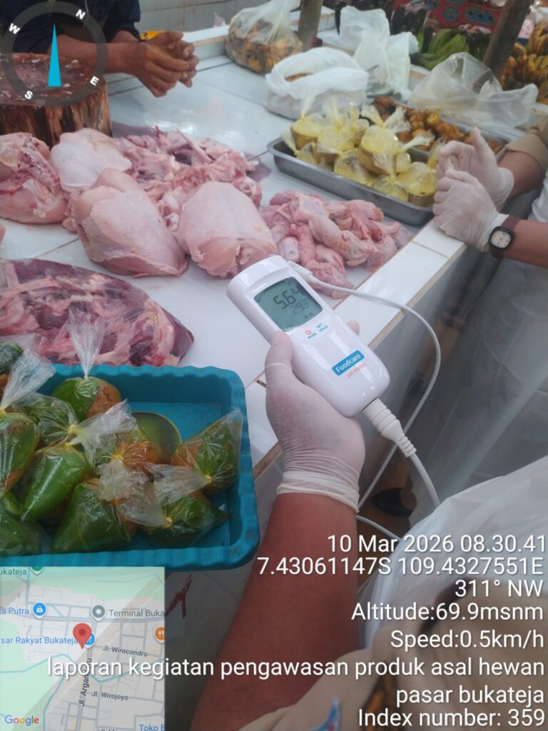 PURBALINGGA – Dinas Pertanian, Pangan, dan Perikanan (DPPP) Kabupaten Purbalingga, Selasa (10/3/2026) kemarin melakukan monitoring terhadap Pangan Asal Hewan (PAH) di Pasar Bukateja. Tim DPPP terdiri dari Bidang Perlindungan Pertanian, Satker Puskeswan Bukateja, fungsional medik dan paramedik veteriner, dan fungsional pengawas mutu hasil pertanian.