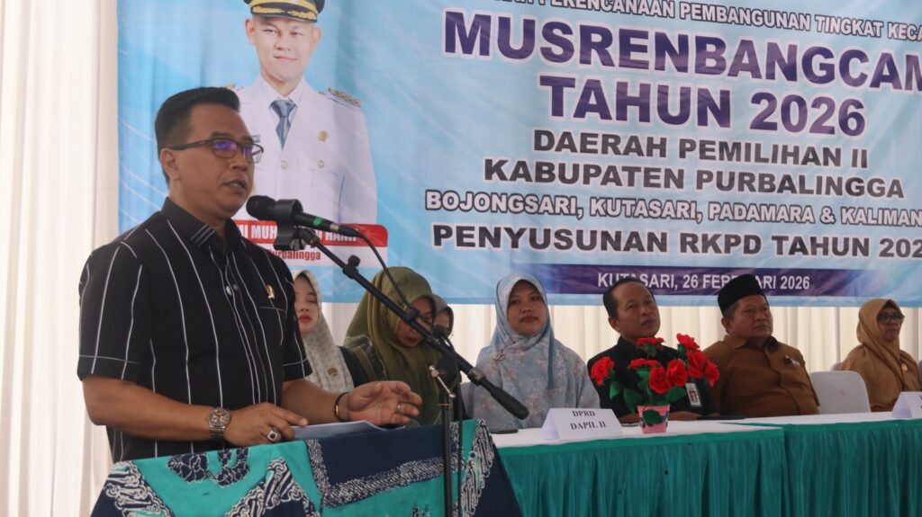 PURBALINGGA INFO – Pemerintah Kabupaten Purbalingga menegaskan perbaikan infrastruktur dasar, khususnya jalan, masih menjadi kebutuhan utama masyarakat dan akan terus diprioritaskan dalam pembangunan daerah. Arah pembangunan tersebut mengemuka dalam Musyawarah Perencanaan Pembangunan Kecamatan (Musrenbangcam) Tahun 2026 Daerah Pemilihan II Kabupaten Purbalingga yang meliputi Kecamatan Bojongsari, Kutasari, Padamara, dan Kalimanah, yang digelar di Aula Kantor Kecamatan Kutasari, Kamis (26/2/26)