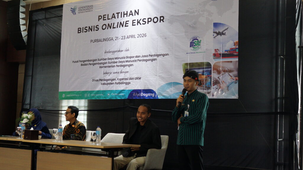 PURBALINGGA – Dinas Perdagangan Koperasi dan UKM (Dindagkopukm) Kabupaten Purbalingga bekerja sama dengan Pusat Pengembangan Sumber Daya Manusia Ekspor dan Jasa Perdagangan (PPEJP) Kementerian Perdagangan RI menggelar Pelatihan Bisnis Online Ekspor selama tiga hari, mulai Selasa (21/4/2026), bertempat di Grand Braling Hotel. Kegiatan ini diikuti oleh 30 pelaku usaha potensial ekspor dari berbagai sektor di Kabupaten Purbalingga.