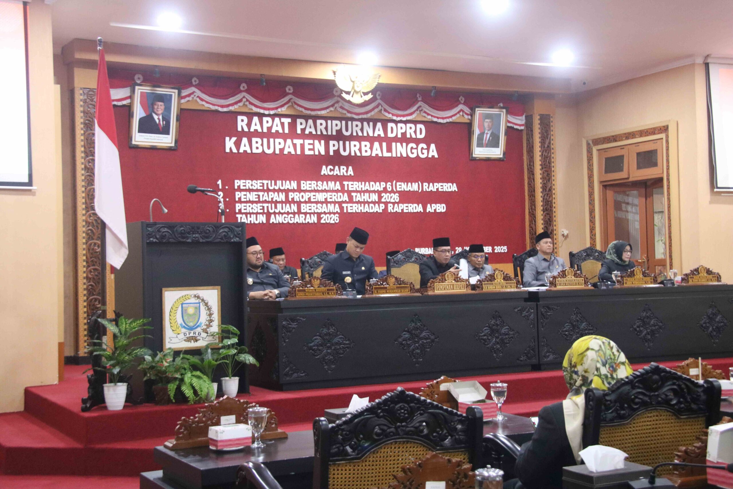 PURBALINGGA – Pemerintah Kabupaten (Pemkab) Purbalingga dan DPRD, Jumat (28/11/2025) di Ruang Rapat Paripurna DPRD Kabupaten Purbalingga menyetujui 6 Rancangan Peraturan Daerah (Raperda) menjadi Perda. Rapat tersebut dihadiri oleh Bupati Purbalingga, H. Fahmi M. Hanif, Wabup, Ketua DPRD, para Wakil Ketua DPRD, Kepala OPD, dan Camat se-Kabupaten Purbalingga.