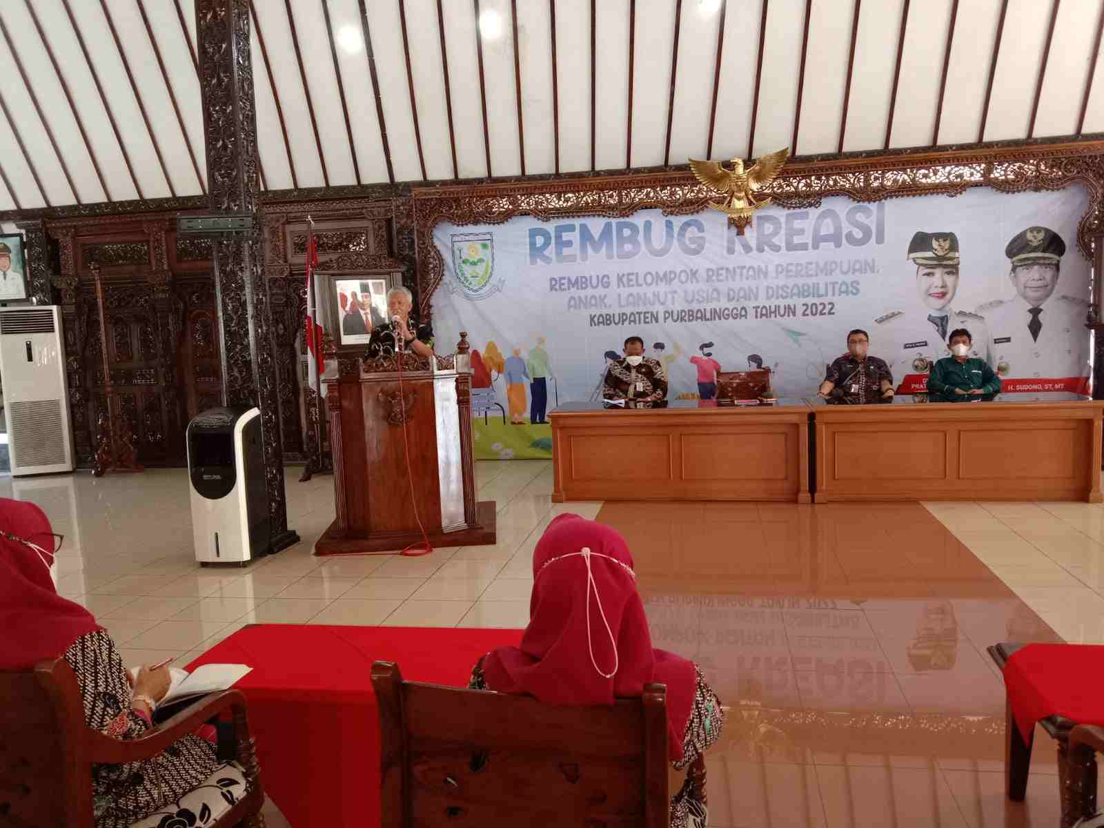 PURBALINGGA, INFO- Pemerintah Kabupaten (Pemkab) Purbalingga berkomitmen untuk mengedepankan kesetaraan pada semua sektor pembangunan. Hal tersebut disampaikan Asisten Ekonomi dan Pembangunan Sekda, Agus Winarno saat melakukan sambutan mewakili Bupati pada acara Rembug Kelompok Rentan, Anak, usia Lanjut dan Disabilitas (Rembug Kreasi) di Pendapa Dipokusumo, Kamis (14/4/2022).