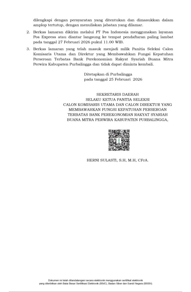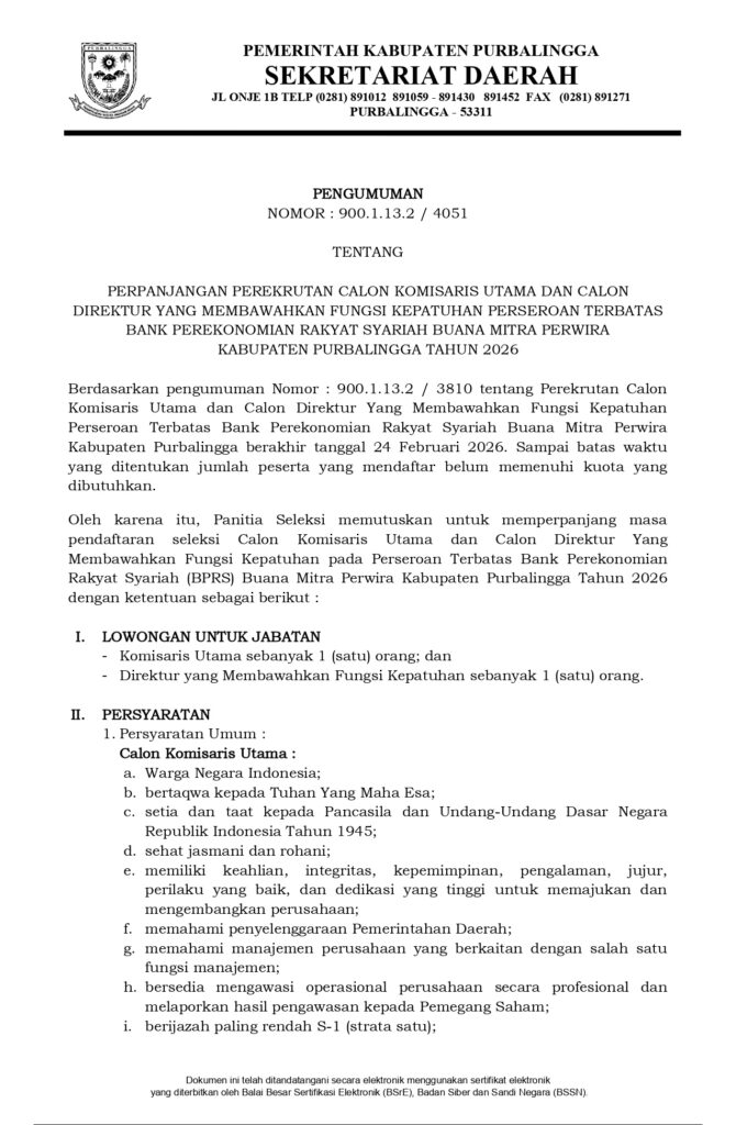 PENGUMUMAN PERPANJANGAN PENGUMUMAN REKRUT CALON KOMUT & DYMFK BPRS BMP 2026 25 – 27 FEB 2026