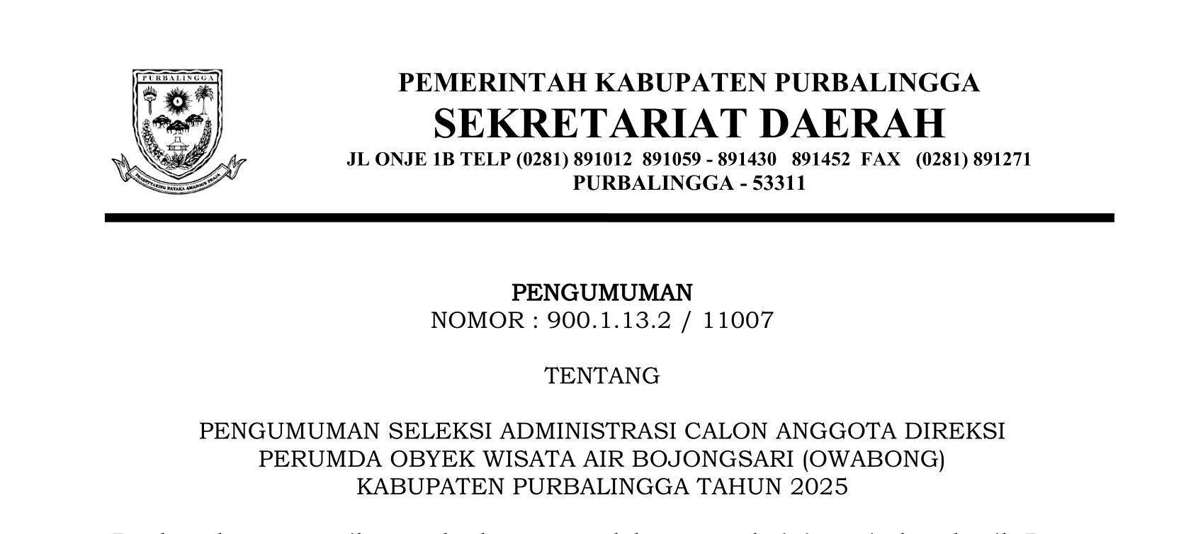 Berdasarkan pemeriksaan berkas atau dokumen administrasi dan hasil Rapat Panitia Seleksi Calon Anggota Direksi Perumda Owabong Kabupaten Purbalingga Tahun 2025 pada Hari Senin, 23 Juni 2025 maka peserta yang dinyatakan memenuhi persyaratan administrasi adalah sebagai berikut :