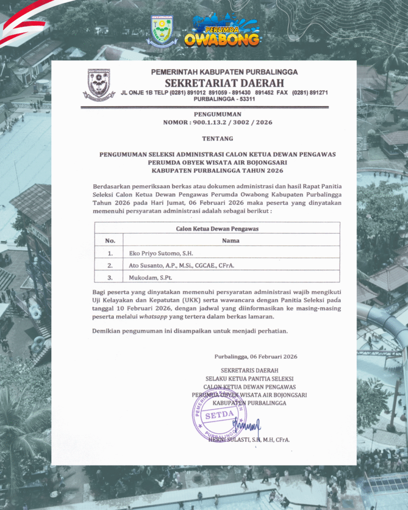 Berdasarkan pemeriksaan berkas atau dokumen administrasi dan hasil Rapat Panitia Seleksi Calon Ketua Dewan Pengawas Perumda Owabong Kabupaten Purbalingga Tahun 2026 pada Hari Jumat, 06 Februari 2026 maka peserta yang dinyatakan memenuhi persyaratan administrasi adalah sebagai berikut: