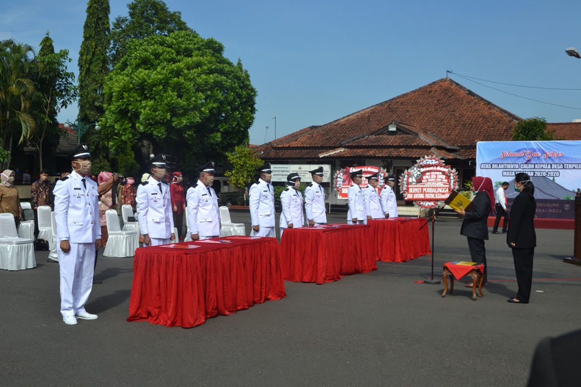 PURBALINGGA – Sebanyak 9 Kepala Desa (Kades) dilantik oleh Bupati Purbalingga melalui Surat Keputusan Bupati Nomor : 141.1/205 Tahun 2020, Kamis (9/4) di Halaman Pendopo Dipokusumo. Usai diambil sumpahnya dan dilantik, Bupati berpesan agar para kades terlantik untuk segera mengambil langkah setrategis dalam pencegahan dan penanganan Covid-19 di desanya masing-masing.
